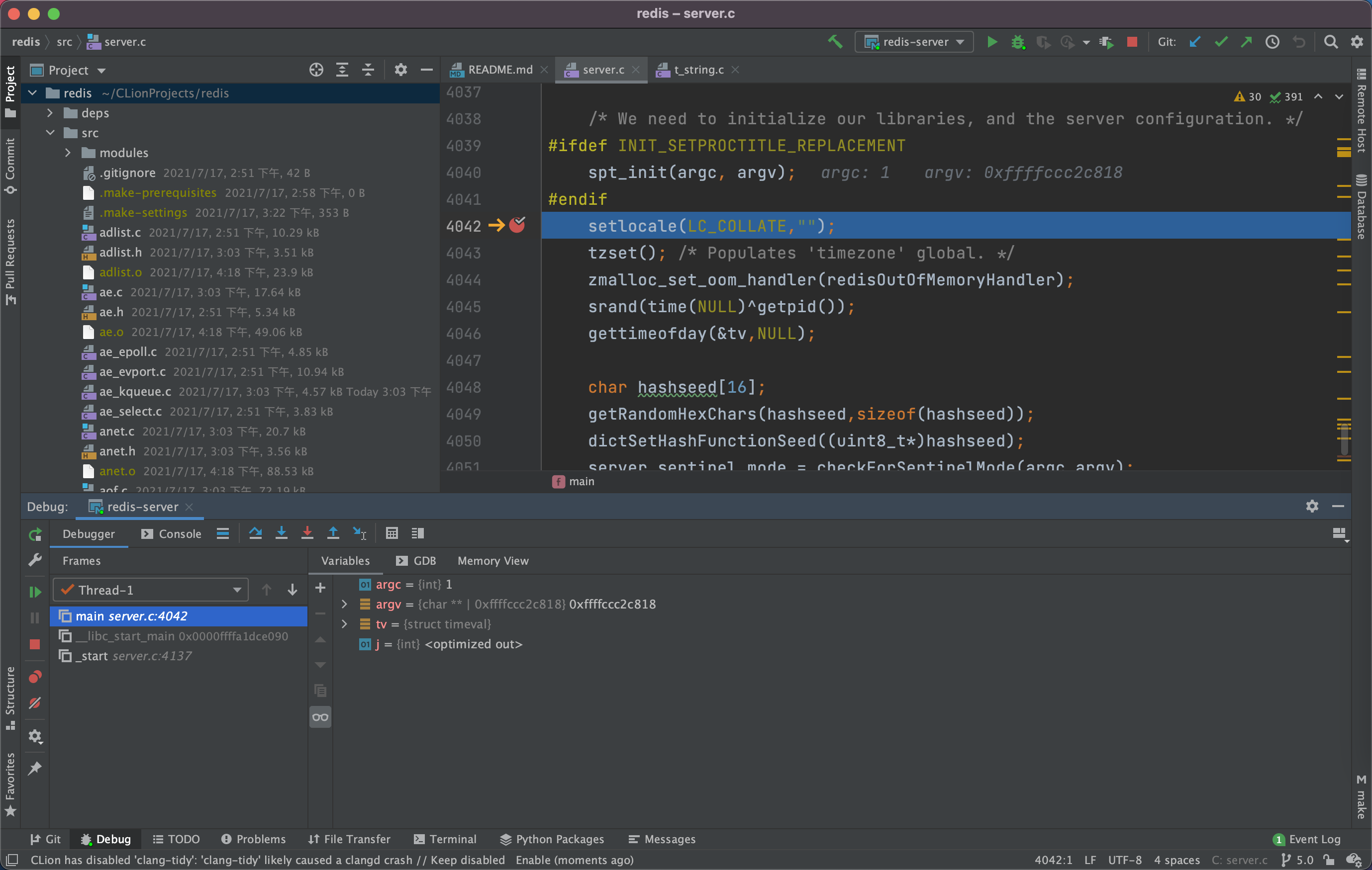 - 然后去 redis-server.c中的 main 打个断点即可